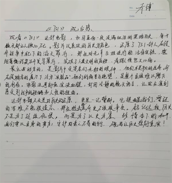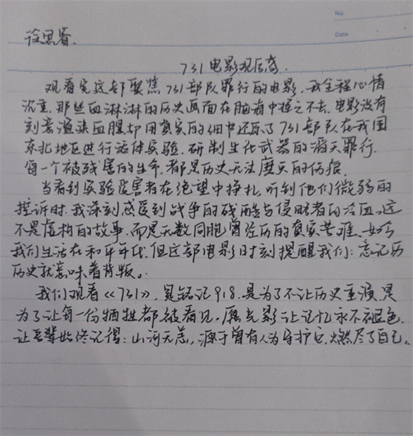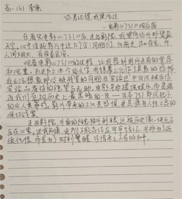 走出影院時(shí),晚風(fēng)卷著落葉打在我校服上。我摸出書(shū)包里的筆記本,在扉頁(yè)一筆一畫(huà)寫(xiě)下“勿忘”。筆尖頓了頓,落下的墨點(diǎn)像一滴淚,混著沒(méi)擦干凈的橡皮屑,在紙上暈開(kāi)小小的印記——那是我和那些沒(méi)能長(zhǎng)大的少年,悄悄立下的約定。——高一(6)班 朱泓瑞