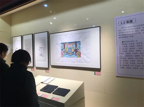 步入木版年畫展廳,五彩斑斕的年畫世界瞬間映入眼簾。一幅幅精美的年畫仿佛帶人穿越時(shí)空,回溯至舊時(shí)光的揚(yáng)州街頭巷尾。畫中慈眉善目的老壽星手捧壽桃,身旁圍繞著嬉笑玩耍的孩童,寓意著家庭和睦、多福多壽,其鮮艷明亮的色彩搭配、夸張生動(dòng)的人物造型,引得同學(xué)們駐足凝視,嘖嘖稱贊。