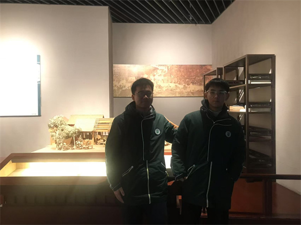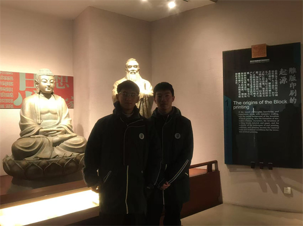 走上2樓,雕版印刷展廳入口,一組栩栩如生的雕像吸引眾人目光。匠人們圍坐,專注于手中活計(jì),有的正持刀在木板上精雕細(xì)琢,木屑簌簌落下,線條于木板上漸次明晰;有的手持棕刷,蘸墨后在版上均勻涂抹,神情專注嚴(yán)謹(jǐn),似要將畢生技藝傾注其中。這些雕像生動(dòng)還原了雕版印刷制作過程。繼續(xù)沿著展廳路線深入,一幅宏大的雕版印刷歷史長(zhǎng)卷徐徐展開。這讓每一個(gè)同學(xué)在觀展中,切身感悟到這項(xiàng)古老技藝從萌芽、發(fā)展到鼎盛的曲折歷程。