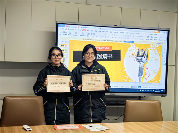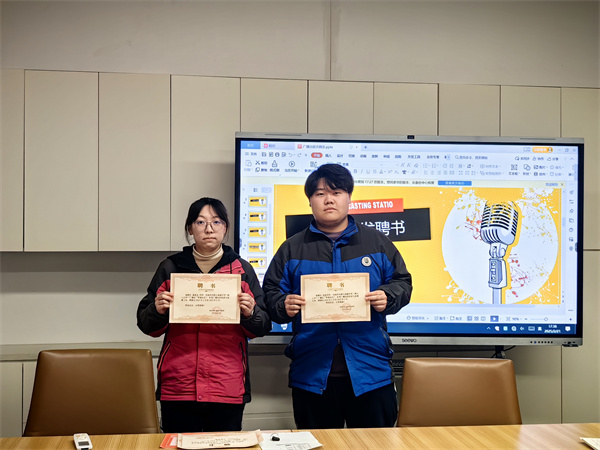 第三項(xiàng)議程是聘書頒發(fā)。首先,王書記充分肯定了高三年級的冉優(yōu)同學(xué)和姜奕言同學(xué)對廣播站持續(xù)的付出,向他們頒發(fā)廣播站“榮譽(yù)站長”聘書。隨后,向王怡涵同學(xué)和夏天樂同學(xué)頒發(fā)了廣播站“站長”聘書,表揚(yáng)他們的專業(yè)表現(xiàn)和帶頭作用。