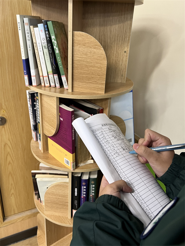課間,不斷有同學(xué)前來(lái)借書(shū)。在圖書(shū)管理員的有序組織下,同學(xué)們認(rèn)真地將姓名、借書(shū)日期、書(shū)名等信息登記在表格上,確保借書(shū)、還書(shū)流程規(guī)范,有跡可循。