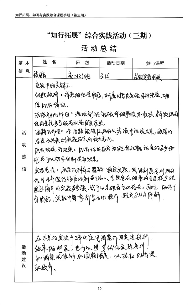 高二生物實(shí)踐課則選擇了生物選修三課本中DNA的粗提取與鑒定實(shí)驗(yàn),實(shí)驗(yàn)材料包括動(dòng)物樣品雞血,植物材料包括洋蔥、花菜、香蕉,目的是探究何種材料效果更好。通過此次活動(dòng)內(nèi)容,能夠加深學(xué)生理論知識(shí)理解,培養(yǎng)學(xué)生科學(xué)探究能力,提高實(shí)驗(yàn)操作技能,激發(fā)學(xué)生興趣和好奇心,培養(yǎng)團(tuán)隊(duì)精神和嚴(yán)謹(jǐn)?shù)目茖W(xué)態(tài)度。本次活動(dòng)學(xué)生充分發(fā)揮了主觀能動(dòng)性,經(jīng)過不斷的嘗試后得出了洋蔥和花菜更適合作為實(shí)驗(yàn)材料的結(jié)論,并表示今后還會(huì)繼續(xù)積極報(bào)名參與生物實(shí)踐課,豐富自己的課余生活。