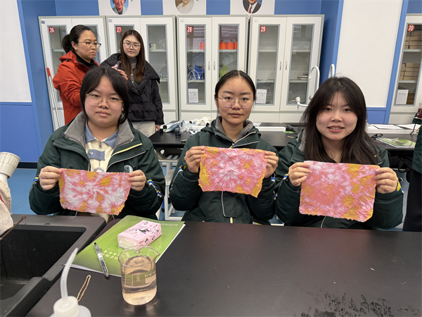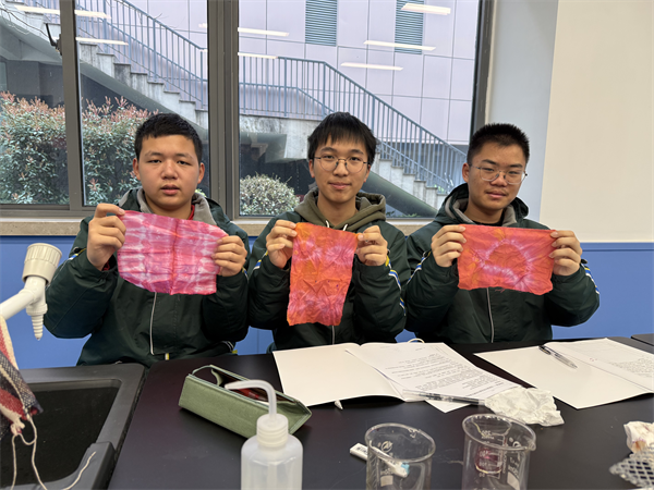 高一化學(xué)組夏菁老師統(tǒng)籌策劃,吳邁、郭巧妮兩位化學(xué)教師聯(lián)合開設(shè)特色課程,帶領(lǐng)高一學(xué)生以傳統(tǒng)扎染工藝為載體,探索化學(xué)學(xué)科的魅力。吳邁老師首先通過微課解析扎染工藝中的化學(xué)密碼,從植物染料的萃取到纖維固色原理,將課本中的氧化還原反應(yīng)、酸堿中和等知識(shí)點(diǎn)具象呈現(xiàn)。隨后郭巧妮老師演示古法扎染技法,指導(dǎo)學(xué)生分組進(jìn)行創(chuàng)意實(shí)踐。同學(xué)們?cè)诮尽⒀趸?、拆線的過程中,親歷了蘇木、梔子等植物染料在棉布上的顯色反應(yīng),更通過控制pH值創(chuàng)造出漸變暈染效果。