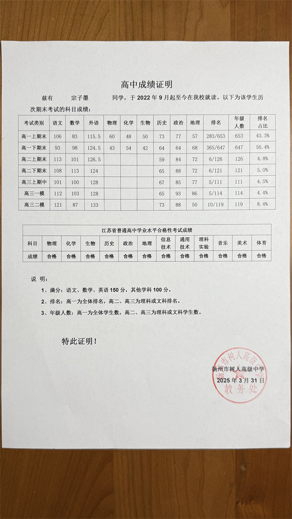 我校2025屆高三(11)班 宗子墨 同學(xué)擬參加 揚(yáng)州大學(xué) 2025年綜合評價招生報名,現(xiàn)予以公示。公示時間為 5月6日至5月9日。有異議者可向?qū)W校教務(wù)處反映,聯(lián)系電話0514-89991060