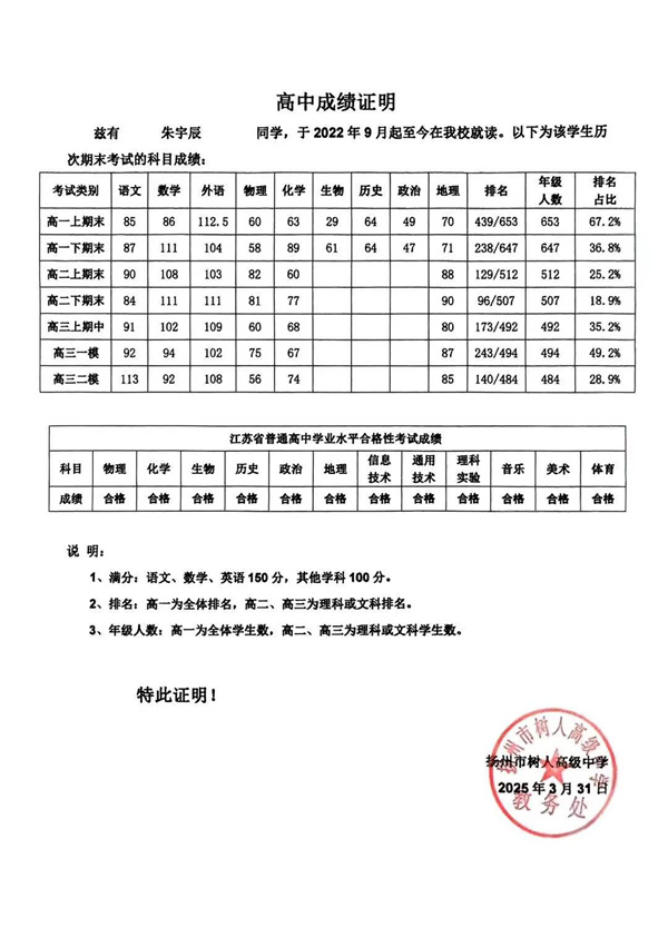 我校2025屆高三(4)班 朱宇辰 同學擬參加 南京工業(yè)大學 揚州大學 2025年綜合評價招生報名,現(xiàn)予以公示。公示時間為 5月 6 日至 5 月 9 日。有異議者可向學校教務處反映,聯(lián)系電話0514-89991060
