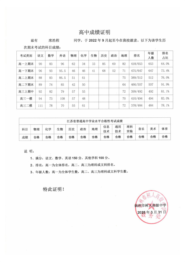 我校2025屆高三(6)班 席浩程 同學擬參加 揚州大學 南京信息工程大學 南通大學 常州大學 南京工業(yè)大學2025年綜合評價招生報名,現(xiàn)予以公示。公示時間為5月6日至5月8日。有異議者可向學校教務處反映,聯(lián)系電話0514-89991060