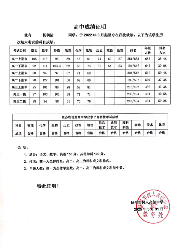 我校2025屆高三(9 )班 楊朝清 同學(xué)擬參加 揚(yáng)州大學(xué) 2025年綜合評(píng)價(jià)招生報(bào)名,現(xiàn)予以公示。公示時(shí)間為5 月 6 日至 5 月 9 日。有異議者可向?qū)W校教務(wù)處反映,聯(lián)系電話(huà)0514-89991060。