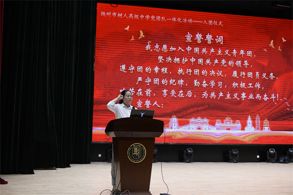 經(jīng)過入團(tuán)申請、民主推薦、團(tuán)支部考察、團(tuán)課培訓(xùn)以及結(jié)業(yè)考試,新團(tuán)員迎來了這莊嚴(yán)神圣的一天。莊嚴(yán)嘹亮的國歌聲中,新團(tuán)員入團(tuán)儀式暨優(yōu)秀團(tuán)員表彰大會正式拉開帷幕。