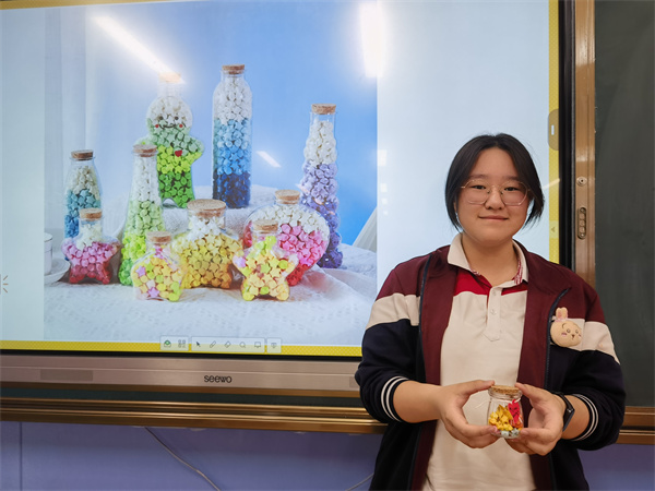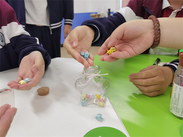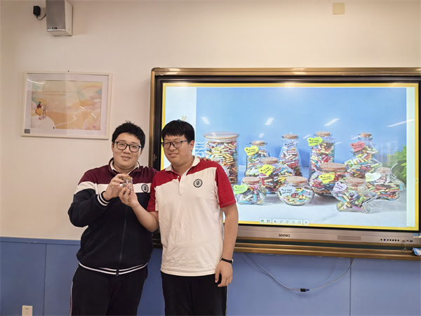 在輕柔的音樂中,同學(xué)們在彩色紙條上寫下對未來的期望或期末目標(biāo),折成“時間膠囊”投入許愿瓶。這些膠囊將被封存至學(xué)期末,屆時重啟,見證成長與堅持的力量。有人寫下“希望期末數(shù)學(xué)突破120分!”“保持高效學(xué)習(xí),少玩手機!”——字里行間滿是堅定的決心。