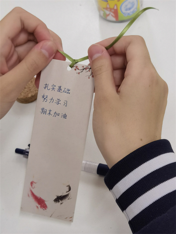 如何高效備戰(zhàn)期末?同學(xué)們制作專屬書簽:正面寫“加法”(如“每天多復(fù)習(xí)一章筆記”“整理錯題本”),反面寫“減法”(如“減少熬夜”“少刷短視頻”)。小小的書簽既是計劃表,也是隨身提醒,幫助大家聚焦目標(biāo),輕裝上陣。