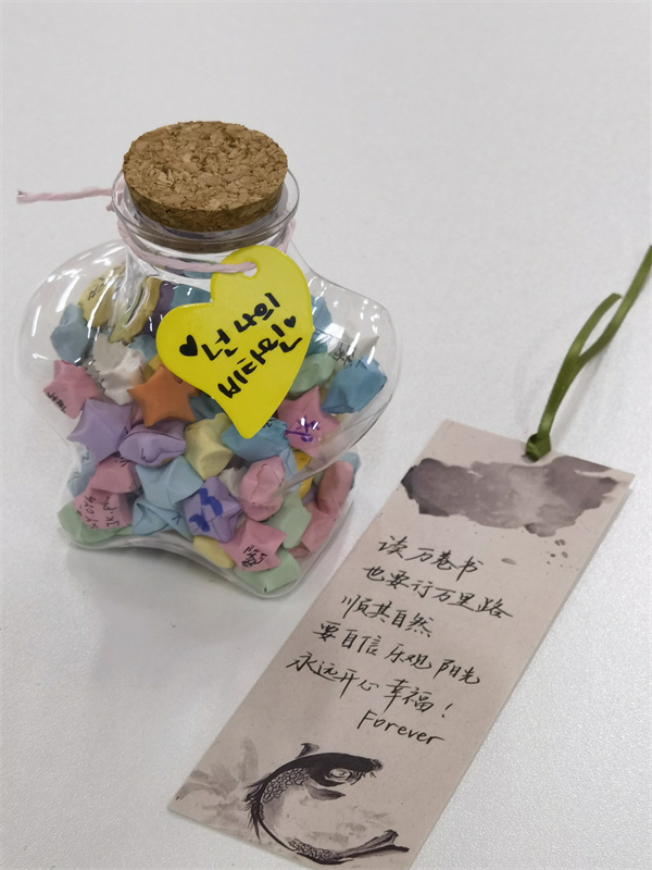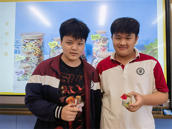 一張星星折紙,承載著對高三畢業(yè)時的自己的寄語。同學(xué)們寫下人生格言、激勵話語,或?qū)ξ磥淼你裤剑骸霸改愀呖柬樌?,不忘初心!”“堅持熱愛,永遠(yuǎn)自信!”這些“心愿星”將收藏在陽光心苑心愿盒中,成為高三時的驚喜禮物。