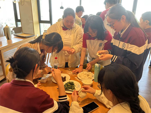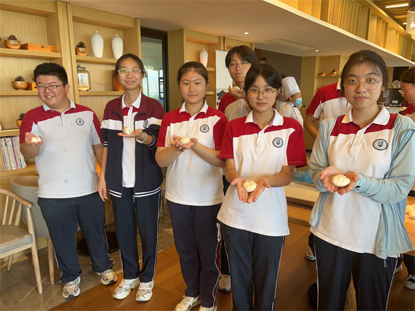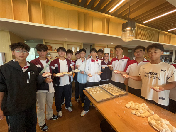 觀看面點師傅熟練的操作后,學生們進行了分組體驗。起初,有的學生捏出的包子褶皺不均,露餡頻出,但在師傅手把手的指導下,逐漸掌握了“提花收口”的訣竅,捏出了一個個飽滿的包子。進行合照紀念時,同學們捧著自己包的包子,臉上透露著滿意的笑。