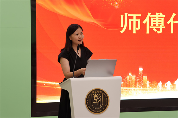 第二項(xiàng)議程:九龍湖校區(qū)教務(wù)處副主任趙焱圍繞“師徒攜手傳薪火,雙崗賦能育新人”展開分享,詳細(xì)介紹了本學(xué)期師徒結(jié)對的實(shí)施方案。該計(jì)劃通過“傳、幫、帶”機(jī)制,為新教師發(fā)展提供有力支持。徒弟代表余恒博發(fā)言,表達(dá)了對學(xué)校搭建成長平臺的感謝,承諾將虛心求教、勤學(xué)篤行。隨后,師傅代表陸云老師作表態(tài)發(fā)言,表示將毫無保留地分享教學(xué)經(jīng)驗(yàn)和育人智慧,為學(xué)校師資隊(duì)伍建設(shè)貢獻(xiàn)力量。
