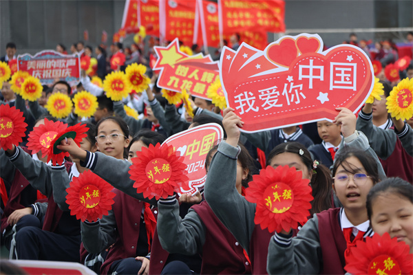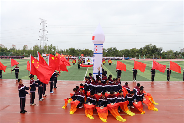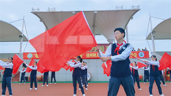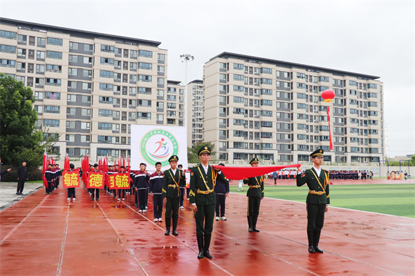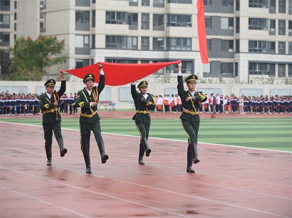 入場式后,升旗儀式開始。伴隨著豪邁雄壯的國歌聲,鮮艷的五星紅旗冉冉升起,迎風(fēng)飄揚(yáng)。全場莊嚴(yán)肅立,齊唱國歌,氣氛熱烈而莊重。