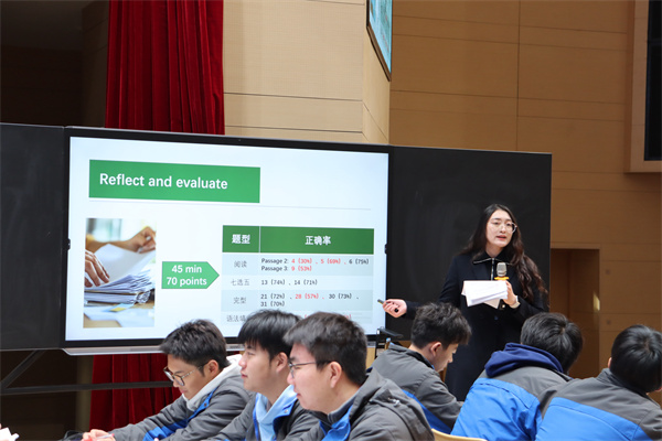 緊接著,是我校的談月老師進(jìn)行的習(xí)題講評(píng)課展示,談老師就高三一輪復(fù)習(xí)作業(yè)紙34期中出現(xiàn)的問題進(jìn)行深入探討。談老師通過提前批閱,發(fā)現(xiàn)學(xué)生作業(yè)紙中出現(xiàn)的一些問題,主要集中在語法填空和閱讀。本堂課,她通過Discuss and Correct,Analyse and Explain,Consolidate and Apply 以及Critical thinking對(duì)語法填空和現(xiàn)象類說明文的策略深入剖析,從詞匯、語法、閱讀過渡到情感態(tài)度價(jià)值觀,為我們呈現(xiàn)了一堂生動(dòng)的習(xí)題講評(píng)課。