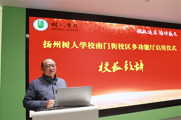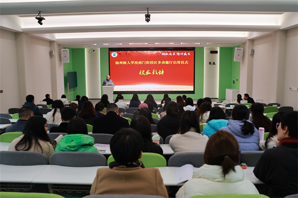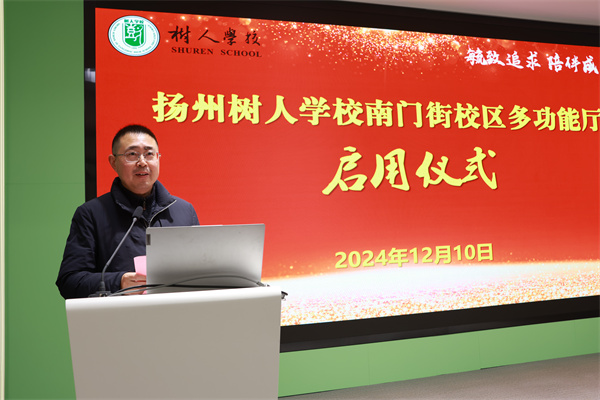 比賽正式開(kāi)始前,揚(yáng)州中學(xué)教育集團(tuán)樹(shù)人學(xué)校黨委書(shū)記、校長(zhǎng)唐煒先生,南門(mén)街校區(qū)校長(zhǎng)姜亞芹女士,兩位來(lái)自揚(yáng)州大學(xué)外國(guó)語(yǔ)學(xué)院的劉艷紅教授、李穎博士及南門(mén)街教務(wù)處主任常松先生共同為南門(mén)街全新的多功能廳啟用儀式揭幕。唐煒校長(zhǎng)為活動(dòng)致辭,闡明了活動(dòng)的重要意義,同時(shí)對(duì)所有英語(yǔ)老師堅(jiān)持說(shuō)英語(yǔ)、用英文授課提出了要求。