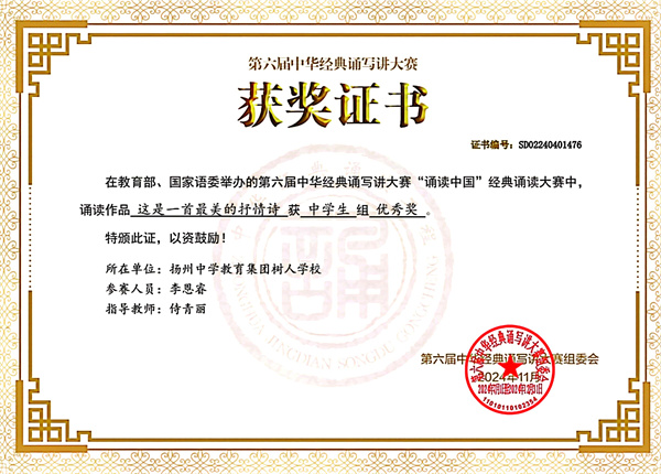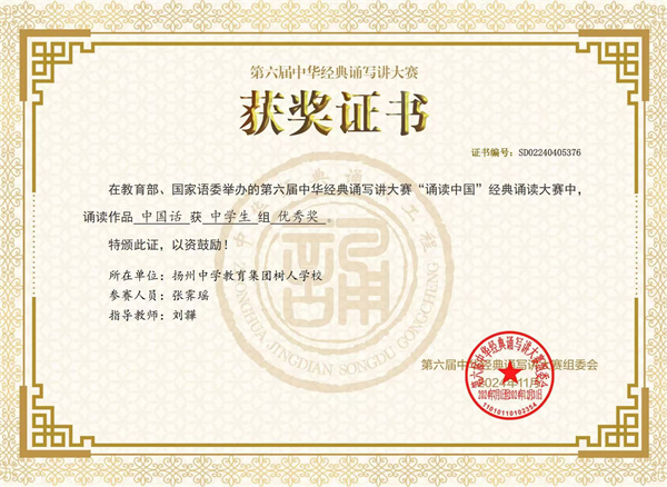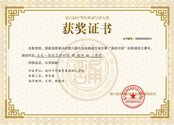 在教育部、國家語委舉辦的第六屆中華經(jīng)典誦寫講大賽“誦讀中國”經(jīng)典誦讀大賽中,我校語文組侍青麗老師獲得教師組二等獎(jiǎng)。我校南門街校區(qū)初二8班張霽瑤同學(xué),初三15班李恩睿同學(xué)獲得中學(xué)生組優(yōu)秀獎(jiǎng)。