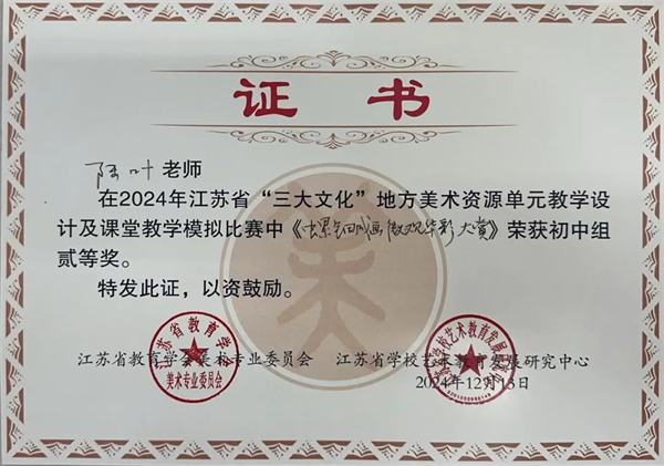 熱烈祝賀我校陸葉老師喜獲2024年江蘇省“三大文化”地方美術(shù)資源單元教學(xué)設(shè)計(jì)及課堂模擬教學(xué)比賽初中組二等獎(jiǎng)。