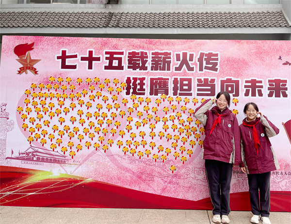 大會(huì)在莊嚴(yán)的國歌聲中拉開序幕。會(huì)議由少先隊(duì)員代表南門街校區(qū)2023級大隊(duì)委尹雅菁和2024級中隊(duì)委金渝皓主持。鏗鏘有力的出旗曲響起,旗手們昂首闊步展隊(duì)旗風(fēng)采,彰顯少先隊(duì)員積極向上的精神風(fēng)貌?,F(xiàn)場的少先隊(duì)員們用挺拔的身姿、嘹亮的歌聲、嚴(yán)明的隊(duì)風(fēng)隊(duì)紀(jì)向隊(duì)旗致敬。