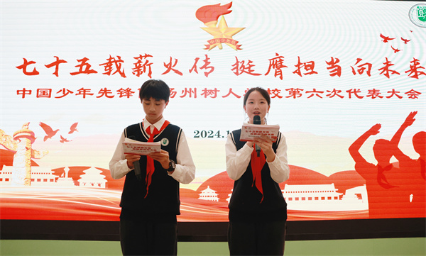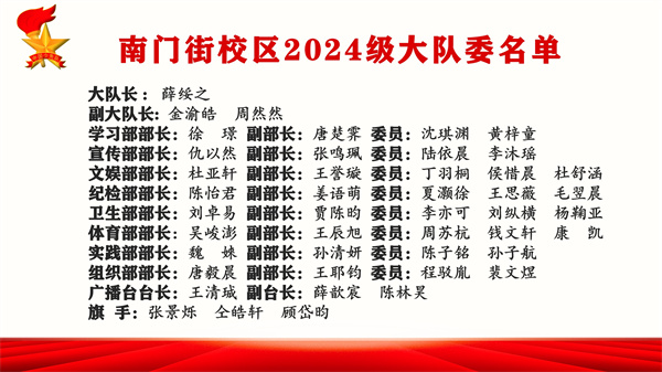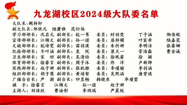 青春必將在拼搏和奉獻(xiàn)的歷程中熠熠閃光,隊(duì)旗必將在我校改革和建設(shè)的進(jìn)程中更加鮮艷。大會(huì)上,由主持人宣讀了新一屆南門街、九龍湖大隊(duì)委名單,通過與會(huì)隊(duì)員代表一致同意,樹人學(xué)校2024級少先大隊(duì)部正式成立!