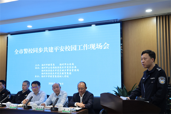 3月26日下午,揚(yáng)州市公安局、揚(yáng)州市教育局聯(lián)合主辦的全市警校同步共建平安校園工作現(xiàn)場(chǎng)會(huì)在我校鳳棲湖校區(qū)召開。