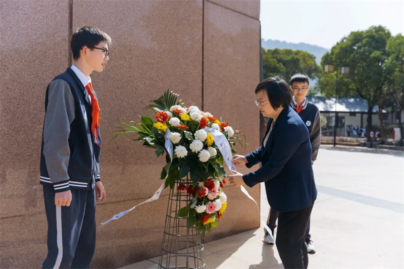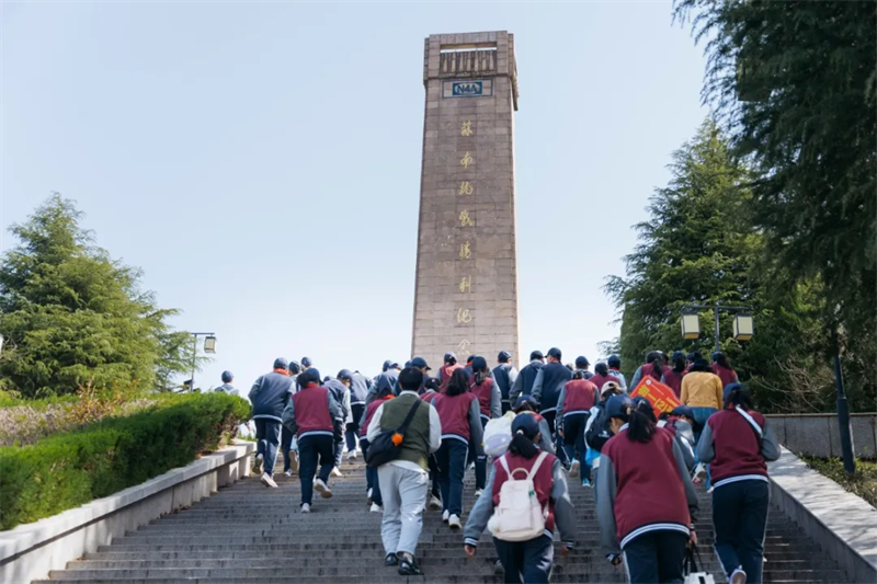 師生列隊攀登297級臺階至蘇南抗戰(zhàn)勝利紀念碑,臺階數象征英烈永存。山頂舉行集體默哀儀式后,學生們將白菊輕放于紀念碑基座,與浮雕戰(zhàn)士的堅毅輪廓形成跨越時空的對話?。