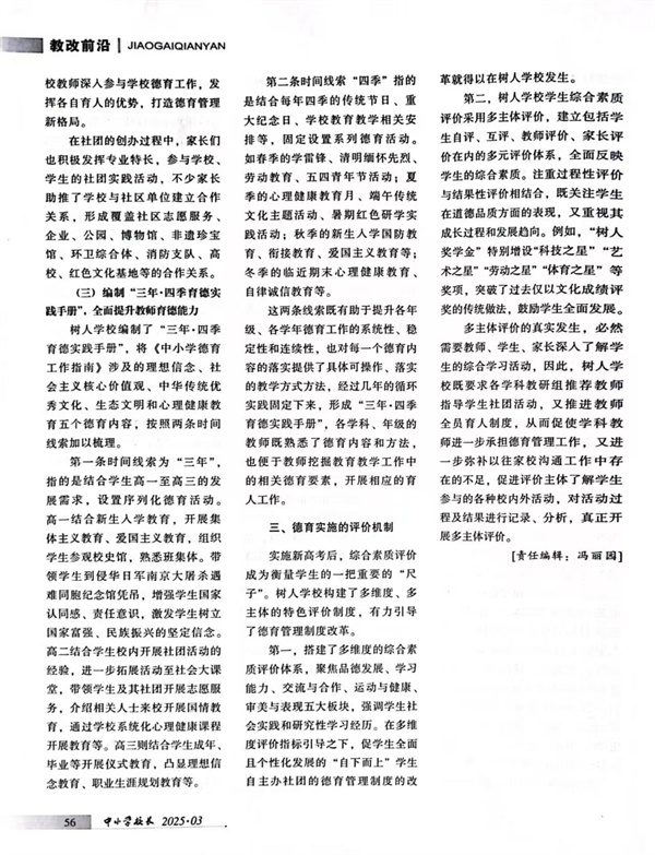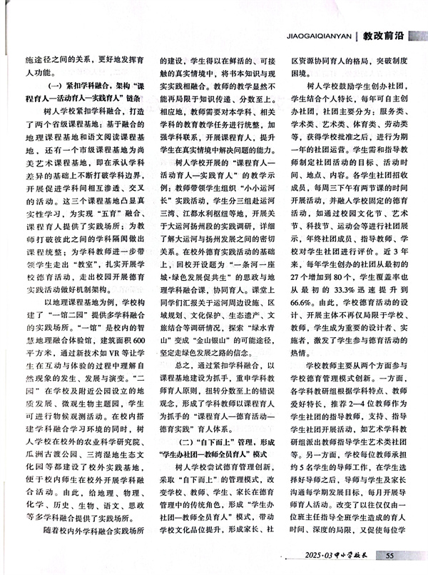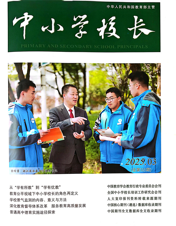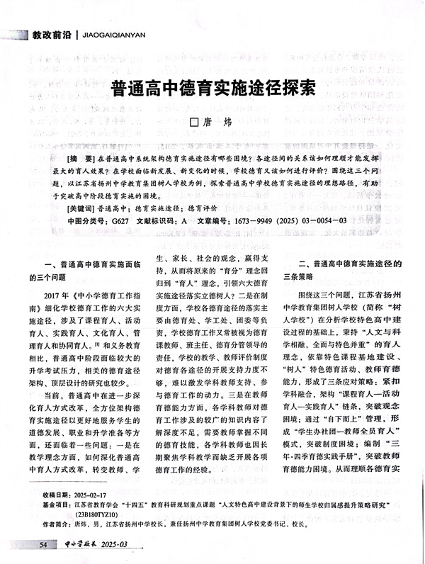 近日,揚(yáng)州中學(xué)教育集團(tuán)樹(shù)人學(xué)校黨委書(shū)記、校長(zhǎng)唐煒在人大復(fù)印報(bào)刊資料轉(zhuǎn)載來(lái)源期刊、中國(guó)核心期刊(遴選)數(shù)據(jù)庫(kù)收錄期刊、中國(guó)期刊全文數(shù)據(jù)庫(kù)全文收錄期刊《中小學(xué)校長(zhǎng)》上發(fā)表了題為《普通高中德育實(shí)施途徑探索》的文章。