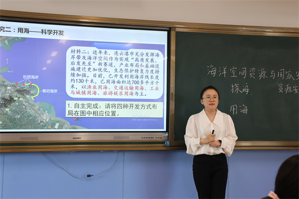 第二節(jié)課,江蘇省新海高級(jí)中學(xué)郭鑫老師以連云港為例,開設(shè)了《海洋空間資源與國(guó)家安全》一課。本節(jié)課分為“探海——識(shí)別資源”“用?!茖W(xué)開發(fā)”和“護(hù)海——維護(hù)安全”三個(gè)篇章,從海洋空間資源的概念入手,使高二12班的學(xué)生對(duì)海洋空間資源對(duì)維護(hù)國(guó)家安全的重要性有了基本認(rèn)知。通過合作討論的形式,依據(jù)任務(wù)清單對(duì)連云港海洋空間資源開發(fā)利用方式及影響進(jìn)行探討,使學(xué)生對(duì)生活中的實(shí)際案例進(jìn)行辯證思考,在對(duì)四項(xiàng)開發(fā)利用方式的討論中,體會(huì)到其對(duì)維護(hù)國(guó)家安全的意義。課堂的最后,以開山島為例幫助學(xué)生樹立正確的海洋觀、環(huán)境觀和安全觀,培育家國(guó)情懷。