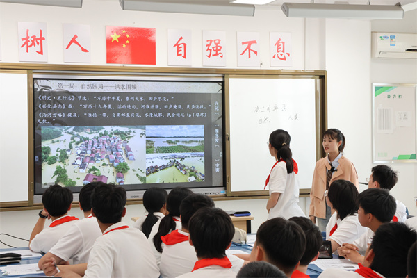 第二節(jié)課,泰州市第二中學(xué)附屬初中劉倩倩老師結(jié)合了地理、歷史、工程等知識(shí)給學(xué)生帶來了一場(chǎng)生動(dòng)形象的水土對(duì)弈,落實(shí)于鄉(xiāng)土地理,呈現(xiàn)了興化垛田的演變。從《天工開物》的淤泥壘田到無人機(jī)巡耕,從“水至而逃”到“千垛花開”證明了文明的最高智慧是讓人地共譜新篇。