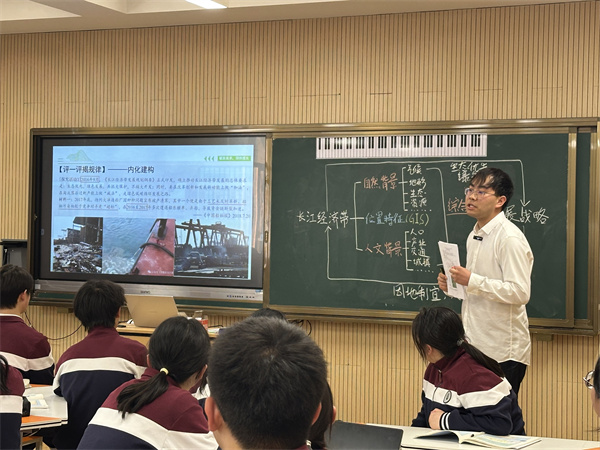 分會(huì)場(chǎng)1的下午第一節(jié)課由樹人學(xué)校高一地理組史一凡老師開設(shè)了《長(zhǎng)江經(jīng)濟(jì)帶發(fā)展戰(zhàn)略》示范課。高一8班的同學(xué)們?cè)谑防蠋煹闹笇?dǎo)下,運(yùn)用地理信息技術(shù)和豐富的地圖集,闡述長(zhǎng)江經(jīng)濟(jì)帶地理位置優(yōu)勢(shì)和四大戰(zhàn)略定位的地理背景,在師生互動(dòng)、生生互動(dòng)中促進(jìn)區(qū)域認(rèn)知和地理實(shí)踐力的提升;在小組討論中了解其發(fā)展特點(diǎn)和影響,培育綜合思維的同時(shí)也感受到家鄉(xiāng)揚(yáng)州在長(zhǎng)江經(jīng)濟(jì)帶中的重要意義;在暢想“黃金水道”向“黃金經(jīng)濟(jì)帶”躍升的未來發(fā)展路徑中,領(lǐng)悟人地協(xié)調(diào)觀在新發(fā)展理念中的滲透。