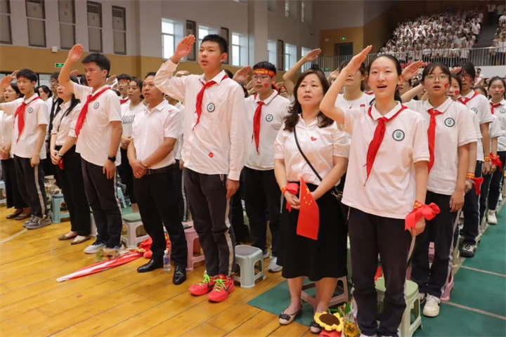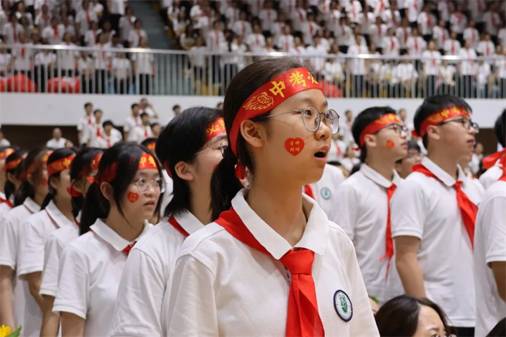 “請全體起立!”主持人清越的聲音穿透場館。千余師生肅然而立,面向鮮紅的國旗齊聲高唱國歌。少先隊員高舉右臂行隊禮,眸光灼灼如炬——無論行至何方,心向華夏永為根。