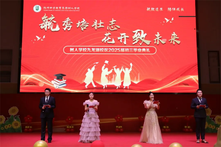 夏木蔭蔭,驪歌悠揚。6月9日晚,樹人學(xué)校九龍湖校區(qū)體育館內(nèi)流光溢彩,以“毓秀培壯志 花開致未來”為主題的2025屆初三畢業(yè)典禮在此隆重舉行。樹人學(xué)校黨委書記、校長唐煒,樹人學(xué)校副校長、九龍湖校區(qū)校長殷翠云,樹人學(xué)校副校長徐建,樹人學(xué)校副校長樊紅山攜全體行政人員,與初三年級師生家長齊聚一堂,在莊嚴(yán)與溫情中共同見證這場青春盛典。