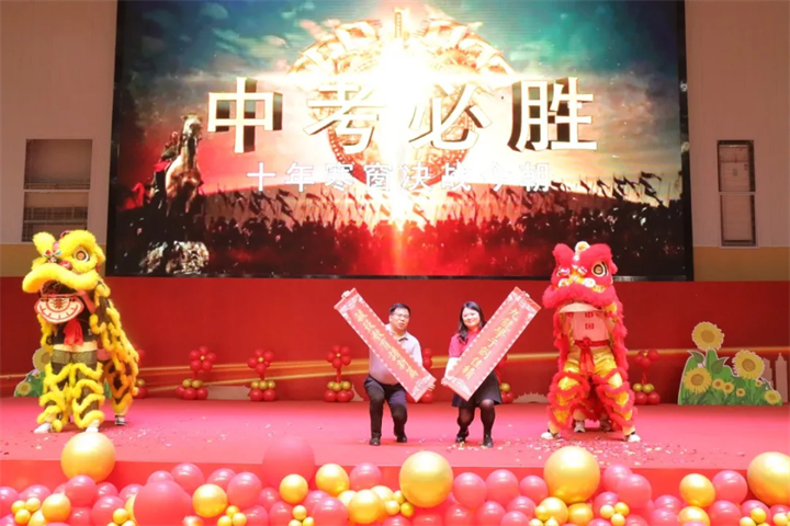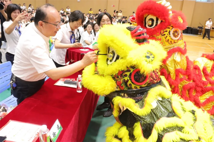 祥獅躍動,福氣必來。樹人學(xué)校校長唐煒飛揚俊筆,為雄獅點睛;初三年級主任張引、副主任沈波接吉納福,共同祝愿九龍湖初三學(xué)子提筆闖關(guān),折桂而歸!