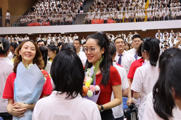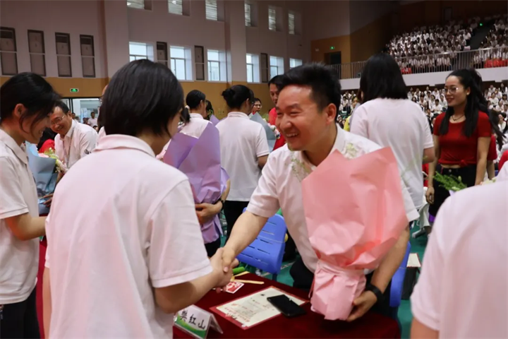 世間萬物皆可變,唯有師道長存。學(xué)生代表手捧鮮花奔向恩師?;ㄏ銖浡?,少年與師長緊緊相擁。這一刻,教育的溫度在無言中傳遞。