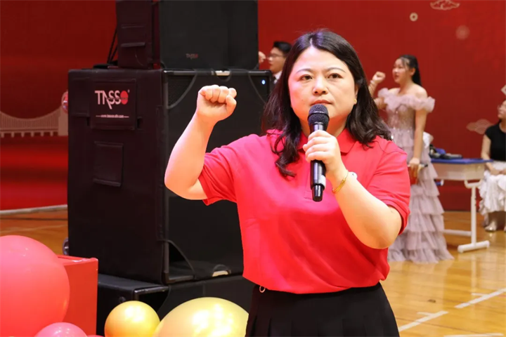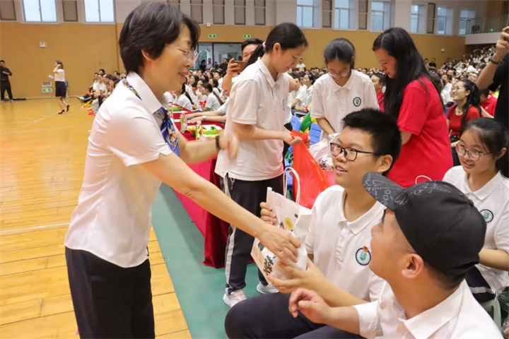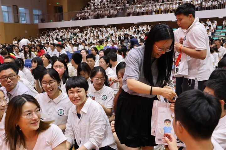 “甜甜綠豆糕,盼君步步高;清香糯米粽,祝爾定高中!”此刻,典禮迎來溫馨高潮:殷翠云校長親手為各班代表送上“糕粽禮盒”。背景屏同步播放班主任寄語視頻,祝愿九龍學(xué)子不負(fù)韶華,輝煌六月,金榜題名,怒放光華!