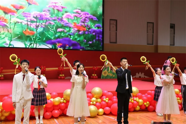 下午六時整,體育館穹頂下回旋著《梔子花開》的輕快樂章,初三學(xué)子身著整齊校服,與恩師并肩踏上紅毯。當(dāng)燈光漸暗,學(xué)生合唱團以一曲《不要慌,山下有月光》傾情開篇,宣告典禮正式啟幕。