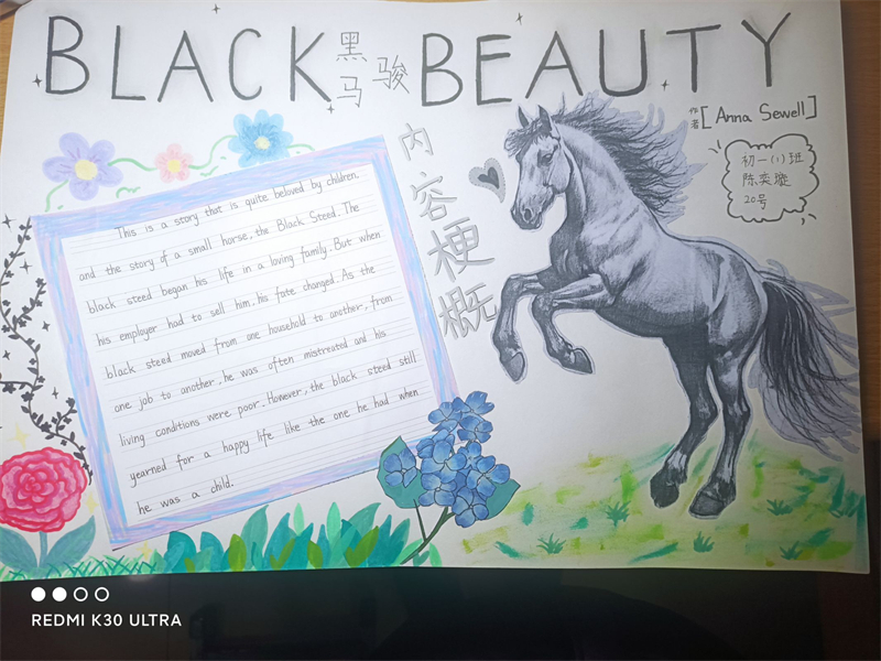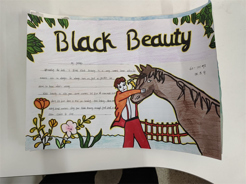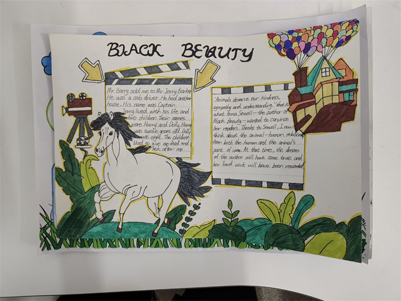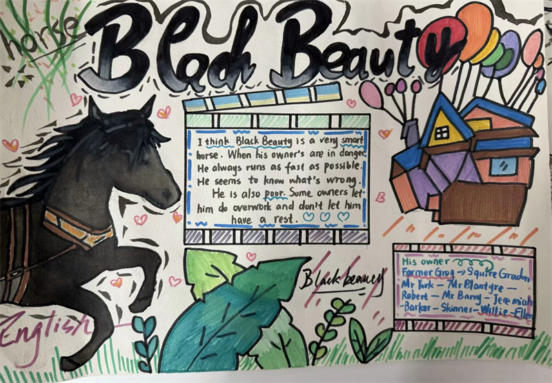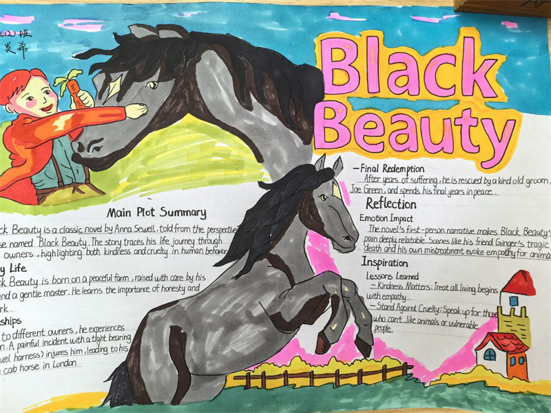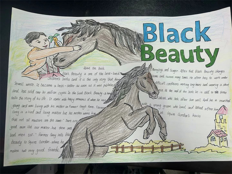 在活動過程中,學生們深入閱讀了《彼得潘》和《黑駿馬》這兩部經(jīng)典名著。有的學生以《黑駿馬》中的經(jīng)典場景為背景,繪制出一幅幅生動的畫面,如白音寶力格與黑駿馬在草原上馳騁的場景,展現(xiàn)了人與馬之間深厚的情感;有的則用優(yōu)美的文字摘抄書中的精彩片段,通過這些文字,學生們仿佛置身于那個充滿溫情與成長的草原世界,有的深入探討了作品中所蘊含的深刻主題。他們通過手抄報的形式,表達了對草原文化的熱愛、對成長的思考以及對人性的感悟;而《彼得潘》中那個永遠長不大的男孩和他的冒險故事,激發(fā)了學生們對自由與童真的向往,學生們在閱讀中汲取靈感,將書中的精彩情節(jié)、生動人物以及深刻的寓意融入到手抄報的設計中。