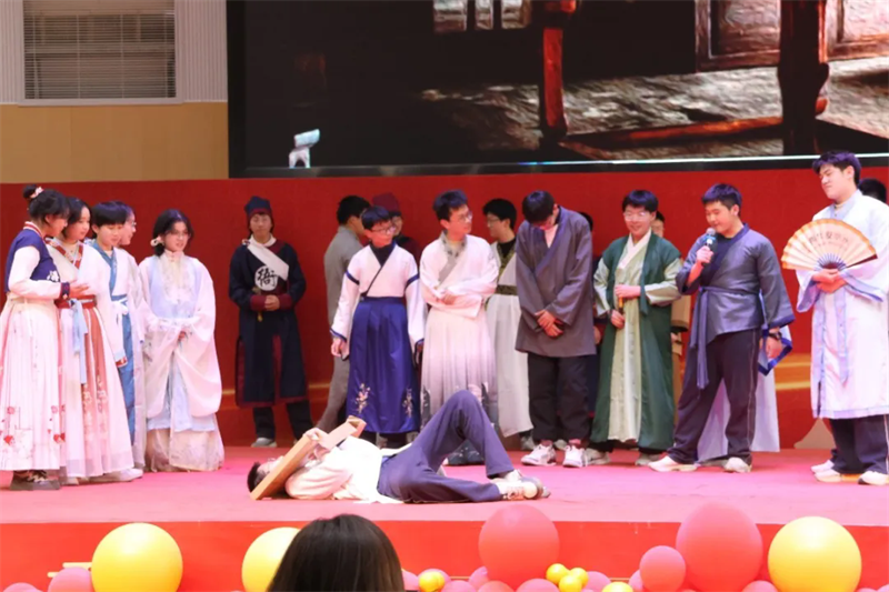 經(jīng)典場(chǎng)景重現(xiàn),叩擊時(shí)代回音?;顒?dòng)以"梅玖周進(jìn)酒宴初識(shí)"拉開(kāi)序幕,學(xué)生演員通過(guò)細(xì)膩的臺(tái)詞與肢體語(yǔ)言,將宴席間暗藏的身份歧視與世態(tài)炎涼展現(xiàn)得淋漓盡致。隨著"周進(jìn)哭號(hào)板"中悲愴的跪地長(zhǎng)嘯、"范進(jìn)中舉"里瘋癲癡笑的荒誕轉(zhuǎn)折,舞臺(tái)燈光與背景音樂(lè)層層遞進(jìn),將科舉制度對(duì)人性的扭曲推向高潮。而嚴(yán)貢生霸占田產(chǎn)的狡詐嘴臉,匡超人墮落時(shí)的掙扎獨(dú)白,更讓觀眾在唏噓中反思名利對(duì)人心的侵蝕。