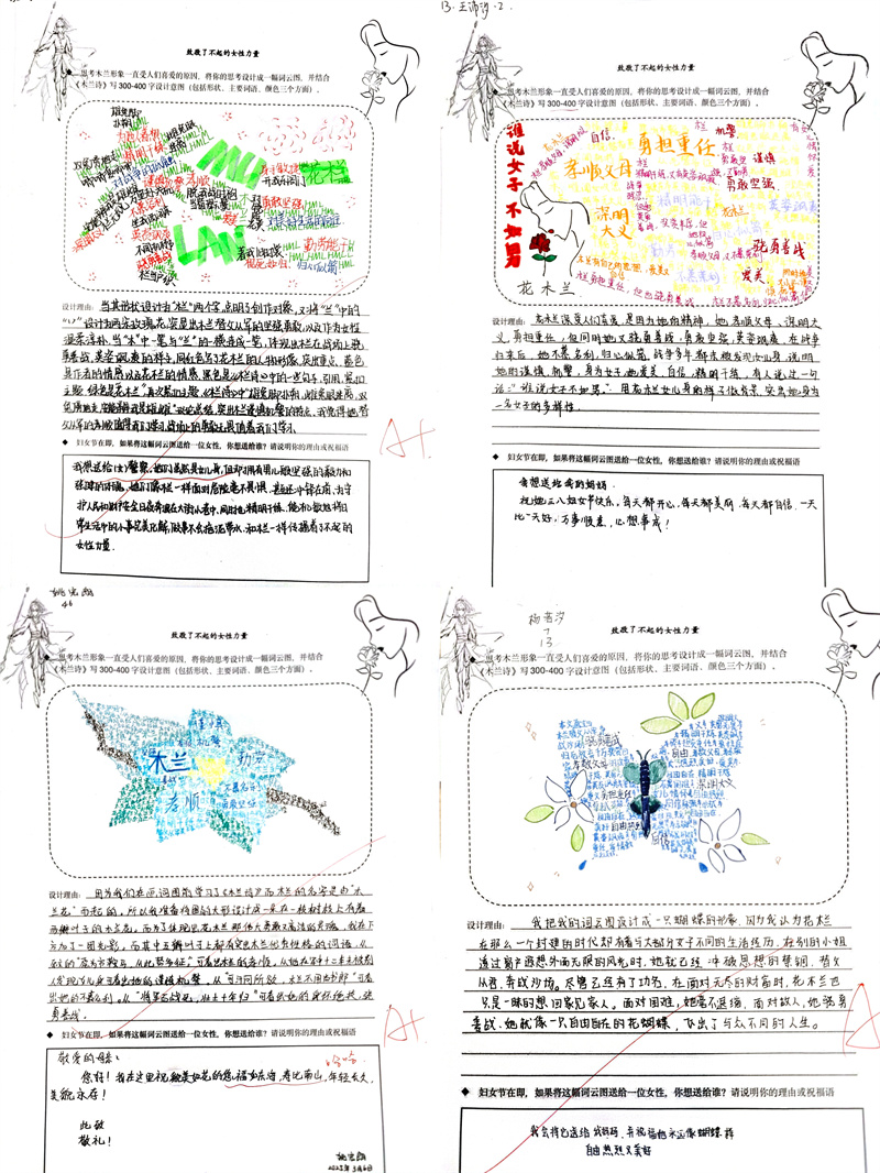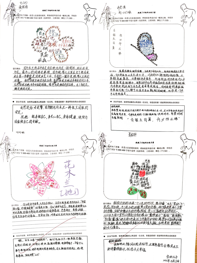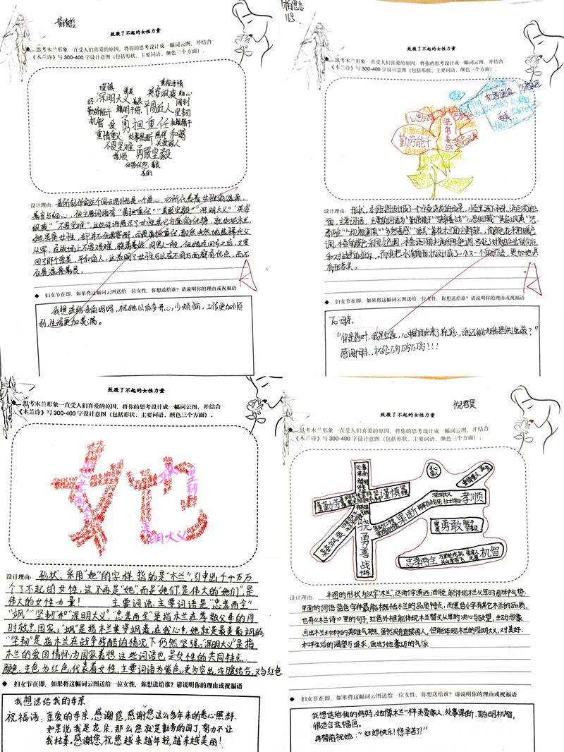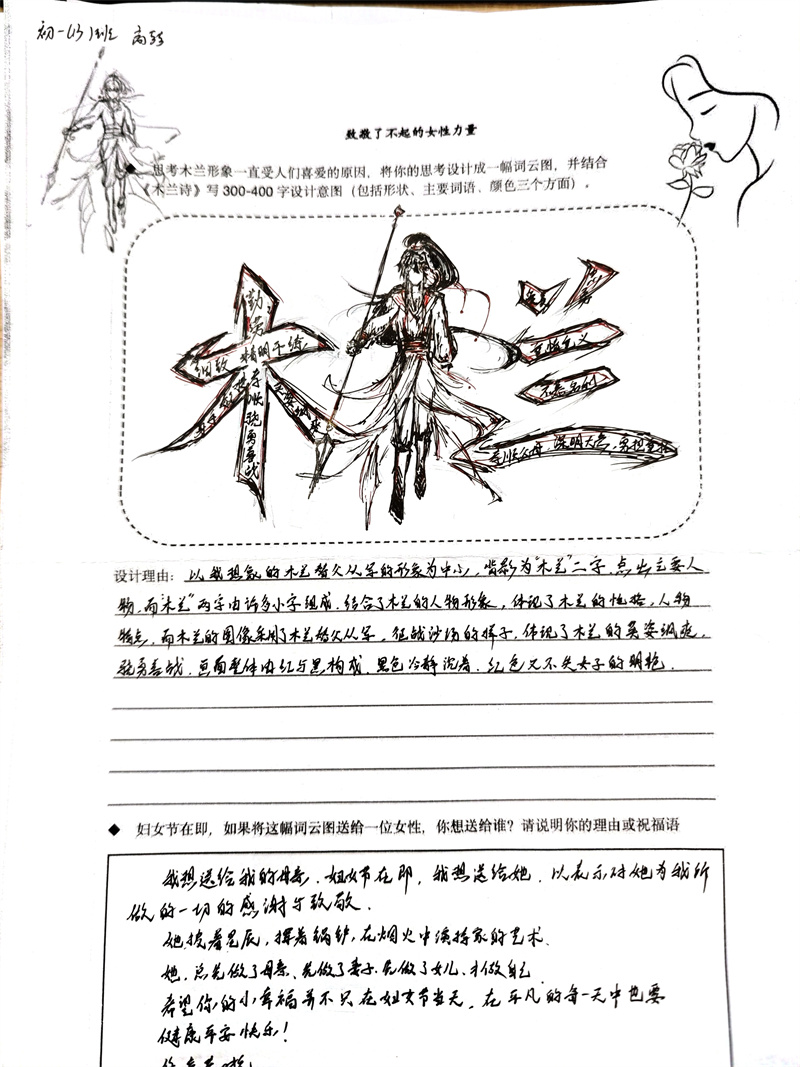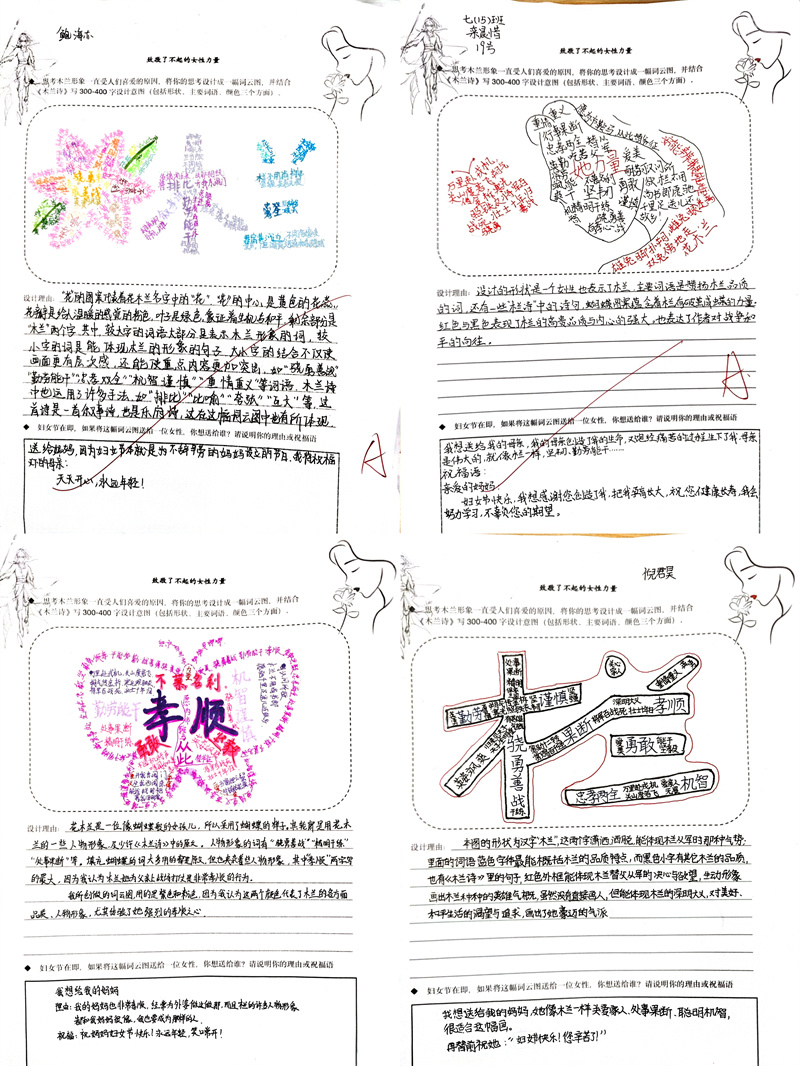 此次活動以“致敬‘她’力量,傳承家國情”為主題,要求學(xué)生結(jié)合《木蘭詩》的內(nèi)容和個人體悟,為木蘭創(chuàng)作一幅詞云圖,并說明設(shè)計理由,然后將它送給一位自己心中的女性榜樣,為她送上節(jié)日祝福。