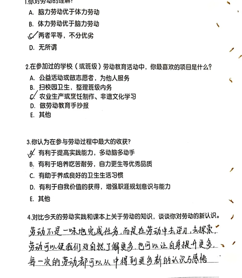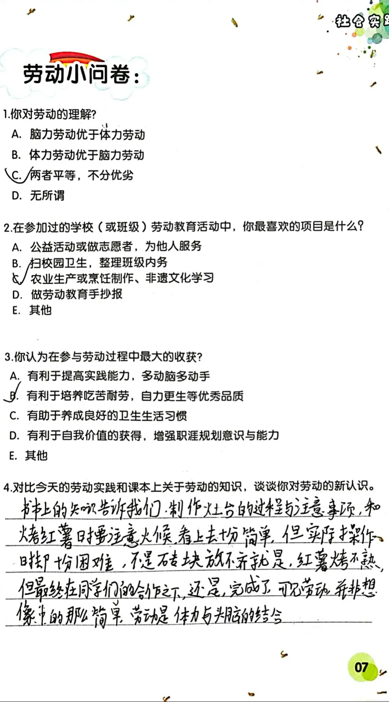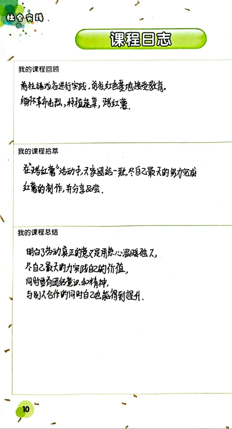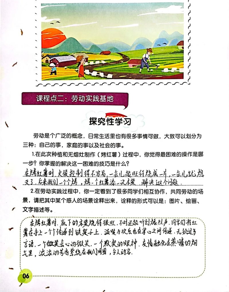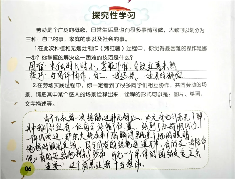 隨后,同學(xué)們來到勞動(dòng)實(shí)踐基地,參與種植與無煙灶制作(烤紅薯)等活動(dòng) 。親手翻土、播種,體驗(yàn)農(nóng)作物生長的初始;合作搭建無煙灶,等待紅薯烤制的過程,讓大家對勞動(dòng)有了全新認(rèn)識。勞動(dòng)不再是課本上抽象的概念,而是親身實(shí)踐中對自然的探索、對技能的掌握,以及對吃苦耐勞精神的培養(yǎng)。同學(xué)們感悟到,勞動(dòng)是創(chuàng)造美好生活的基石,腦力勞動(dòng)與體力勞動(dòng)同等重要,每一次付出都能帶來成長與收獲。