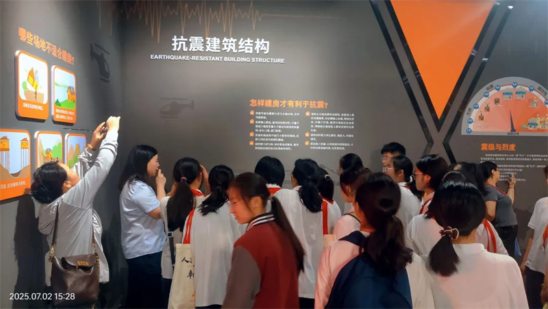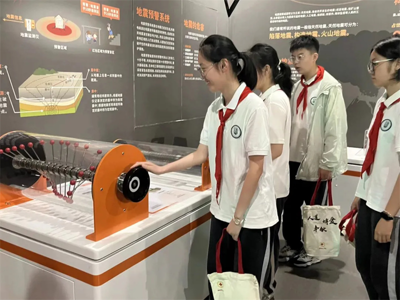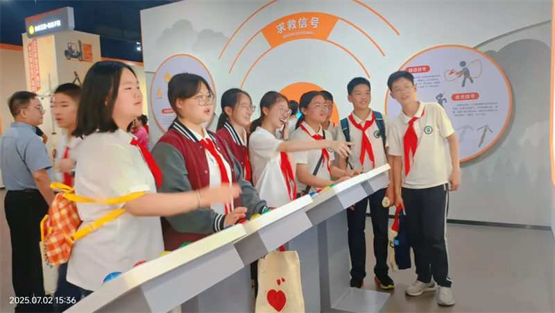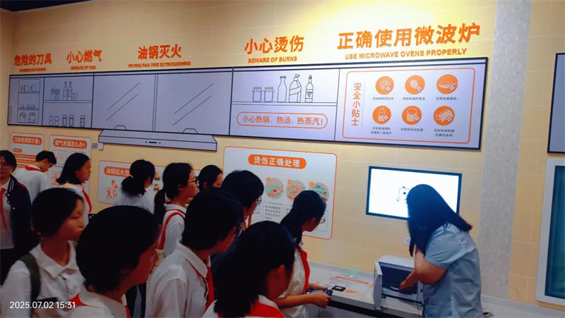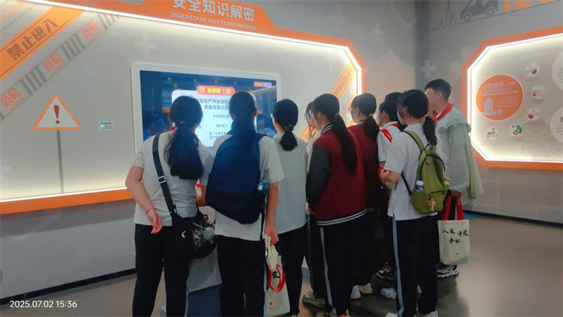 在安全教育展廳,精致的展牌圖文并茂地介紹了生活、出行各方面的安全知識;災(zāi)難劇場、地震小屋,虛實交互的龍卷風(fēng)等模擬訓(xùn)練等更是給同學(xué)們帶來了沉浸式的體驗,吸引了大家積極參與互動。