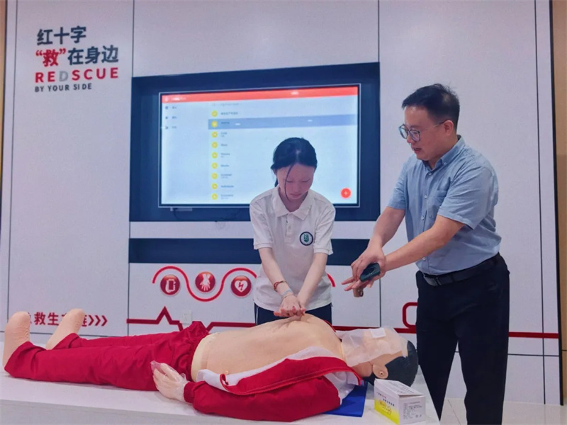 心肺復(fù)蘇術(shù)(CPR)是挽救心臟驟?;颊呱年P(guān)鍵技能。“心臟驟停后4分鐘內(nèi)是搶救的黃金時間,每延遲1分鐘,搶救成功率就下降7%-10%。”在急救技能培訓(xùn)區(qū),紅十字會師資的這句話讓在場學(xué)生都屏住了呼吸。接著,他們?yōu)橥瑢W(xué)們演示了標(biāo)準(zhǔn)的心肺復(fù)蘇操作流程——“發(fā)現(xiàn)有人倒地時,首先要確認(rèn)環(huán)境安全,輕拍雙肩大聲呼喚……”師資們一邊講解,一邊示范正確的按壓手法。同學(xué)們則紛紛上手實踐,認(rèn)真學(xué)習(xí)心肺復(fù)蘇的每一個步驟。從判斷患者意識和呼吸,到進(jìn)行胸外按壓和人工呼吸,通過“5-6厘米的按壓深度”和“每分鐘100-120次的按壓頻率”等關(guān)鍵要點,感受著按壓的力度和節(jié)奏。同學(xué)們在實操后意識到:心肺復(fù)蘇不僅是技術(shù),更是爭分奪秒與死神賽跑的勇氣。