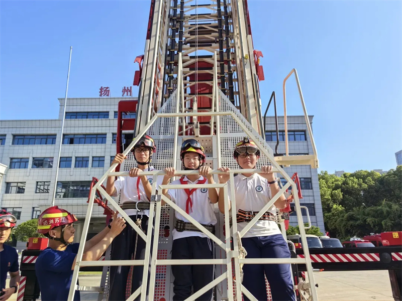 首先,在消防隊(duì)邱隊(duì)長(zhǎng)的帶領(lǐng)下,同學(xué)們首先乘坐云梯,體驗(yàn)高空作業(yè),感受到了高空中恣意的自由。此外,為了使同學(xué)們更好的體驗(yàn)消防戰(zhàn)士們的日常訓(xùn)練,還安排了爬繩和爬梯子的實(shí)踐體驗(yàn)。