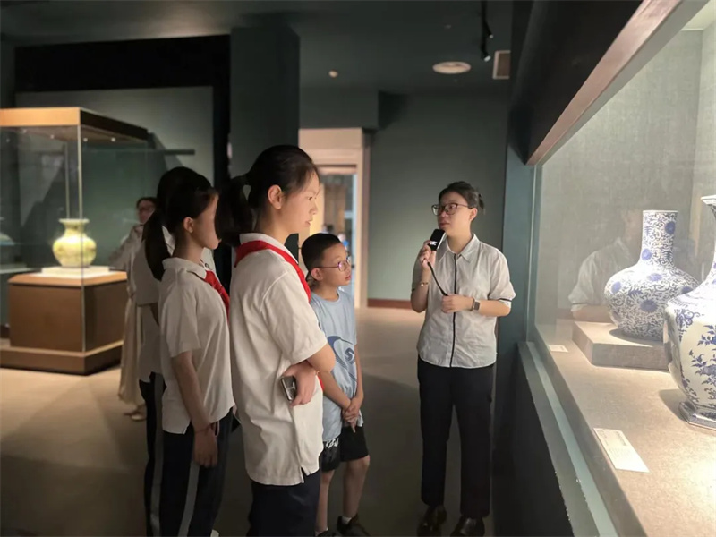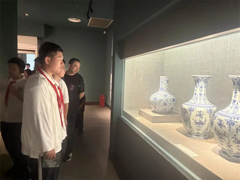 在講解員的引導下,同學們首先步入元明清瓷器展廳。溫潤的甜白釉、素雅的青花瓷,靜靜訴說著古代制造業(yè)的輝煌。講解員細致解讀了瓷器紋飾的文化內(nèi)涵和精湛工藝,讓同學們對泥土蛻變?yōu)樗囆g(shù)珍品的過程有了深刻理解。