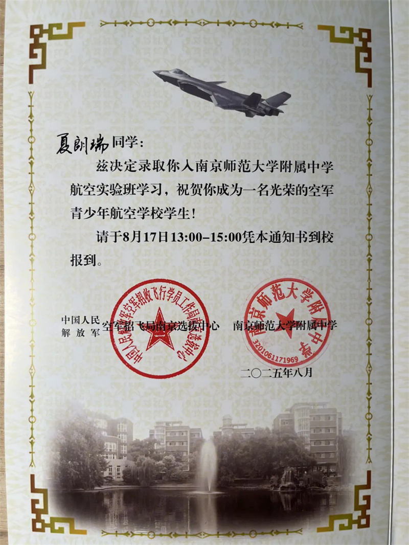 這份喜報,屬于奮勇爭先的學子,更屬于默默耕耘的園??!在此,我們向所有為夏朗瑞傾注心血的老師致以崇高敬意,向夏朗瑞同學及其家長表示最熱烈的祝賀!希望夏朗瑞同學在空軍青少年航空學校繼續(xù)發(fā)揚我校優(yōu)良傳統(tǒng),刻苦訓練、勇攀高峰,早日成長為守護祖國藍天的雄鷹!