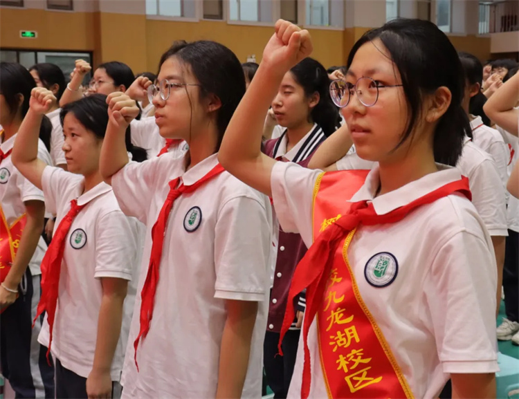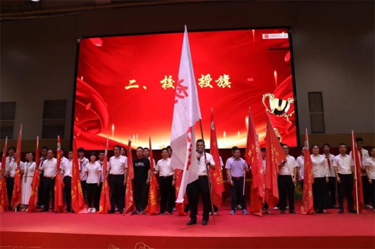 接著,由九龍湖校區(qū)校長(zhǎng)趙平給初三18位班主任老師授旗。初三年級(jí)主任武飛老師帶領(lǐng)全體班主任喊出奮斗誓言,這面迎風(fēng)飄揚(yáng)的旗幟,將引領(lǐng)我們?nèi)w初三師生,乘風(fēng)破浪,勇往直前!