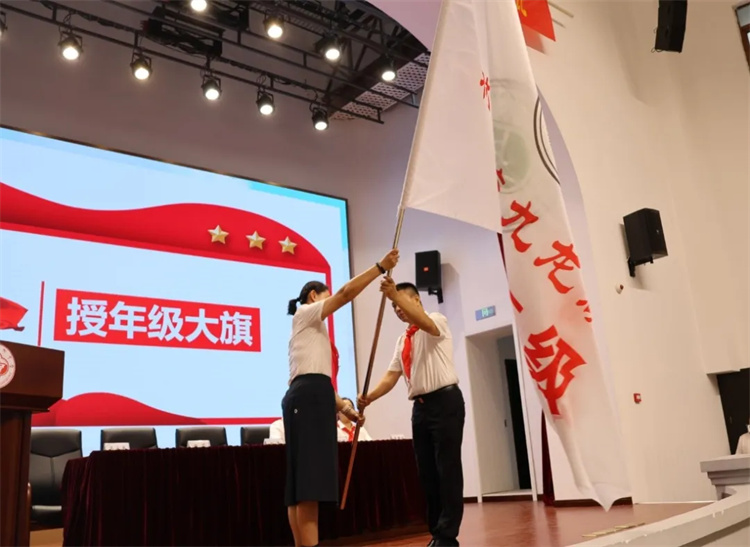 隨后,九龍湖校區(qū)校長(zhǎng)趙平為初一年級(jí)授旗,旗幟傳遞間筑牢少年信念;