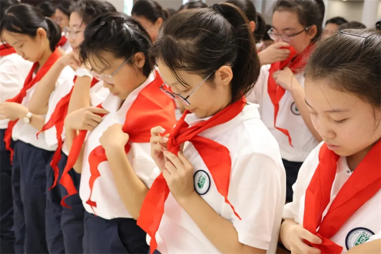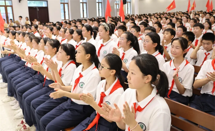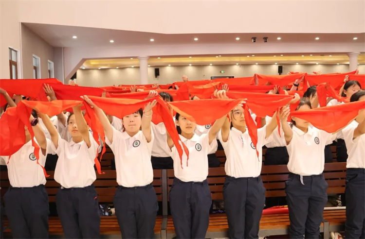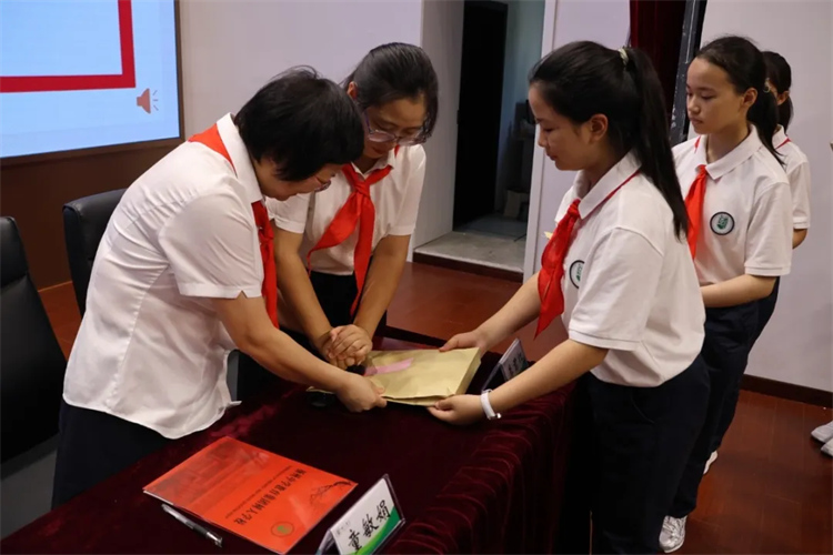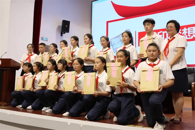 最動(dòng)人的莫過(guò)于換巾儀式。全體少先隊(duì)員起立,摘下小號(hào)紅領(lǐng)巾妥帖收好,再雙手托起大號(hào)紅領(lǐng)巾高舉過(guò)頂——仰望鮮紅一角,緬懷革命先烈,隨后鄭重戴上象征成長(zhǎng)與責(zé)任的新紅領(lǐng)巾,完成從小學(xué)到初中的身份蛻變。儀式現(xiàn)場(chǎng)還設(shè)置 “夢(mèng)想封印” 環(huán)節(jié),在童敏娟校長(zhǎng)的見(jiàn)證下,學(xué)生代表將承載美好愿景的信封封裝,約定三年后百日誓師再啟封,讓夢(mèng)想在奮斗中扎根。