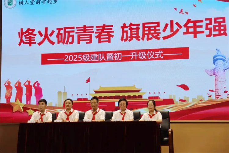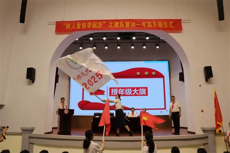 火紅隊(duì)旗引航向,鮮紅領(lǐng)巾系理想。樹(shù)人學(xué)校九龍湖校區(qū)隆重舉行“烽火礪青春 旗展少年強(qiáng)”2025級(jí)建隊(duì)暨初一升級(jí)儀式,樹(shù)人學(xué)校九龍湖校區(qū)校長(zhǎng)趙平、樹(shù)人學(xué)校副校長(zhǎng)童敏娟、九龍湖校區(qū)學(xué)工處主任張蕊、團(tuán)委副書(shū)記馬永嘉、初一年級(jí)主任李君紅出席活動(dòng),全體初一年級(jí)新生齊聚揚(yáng)州中學(xué)樹(shù)人堂,儀式由大隊(duì)輔導(dǎo)員張靜靜老師主持。