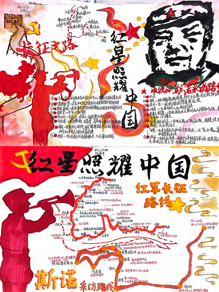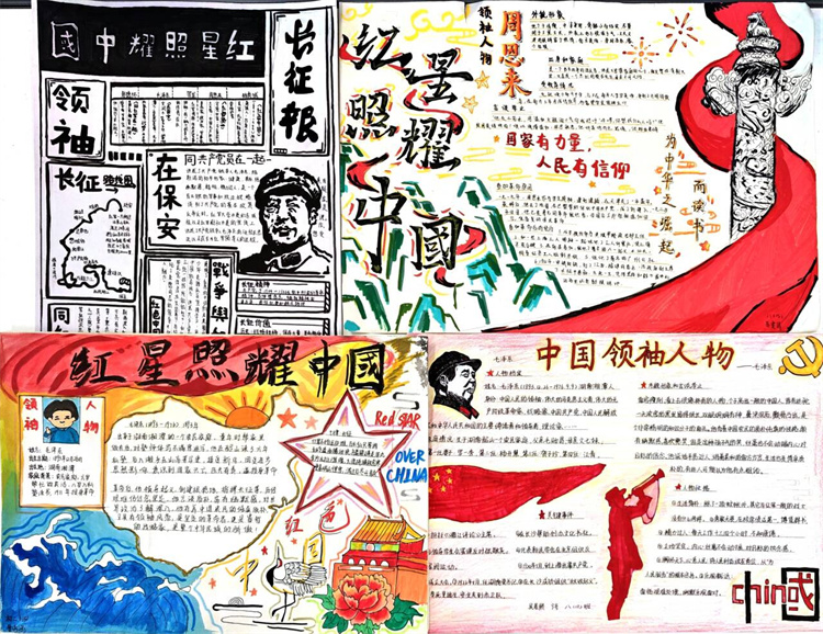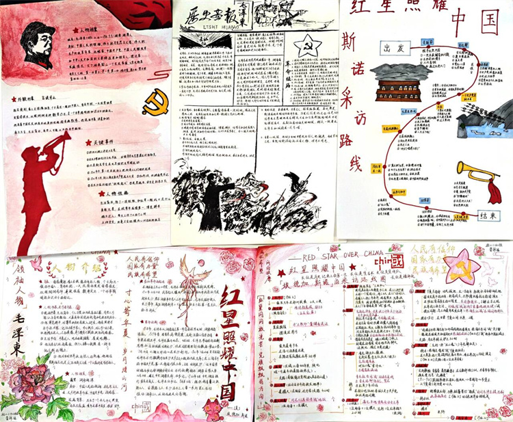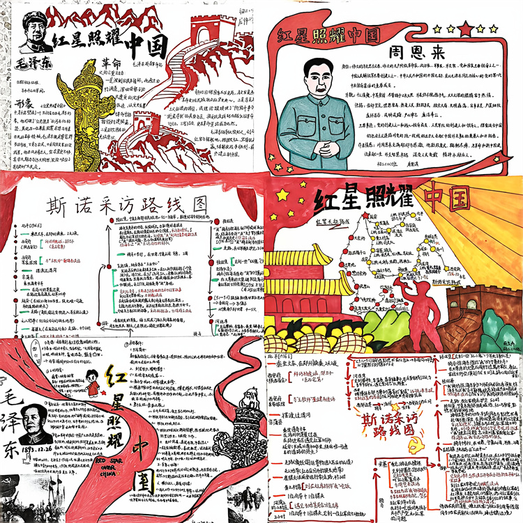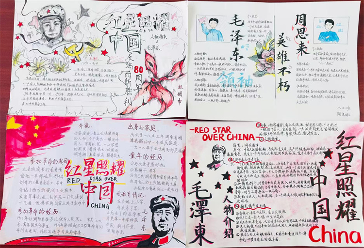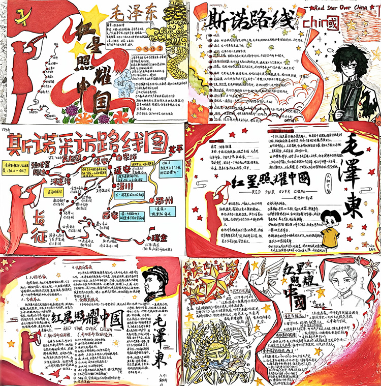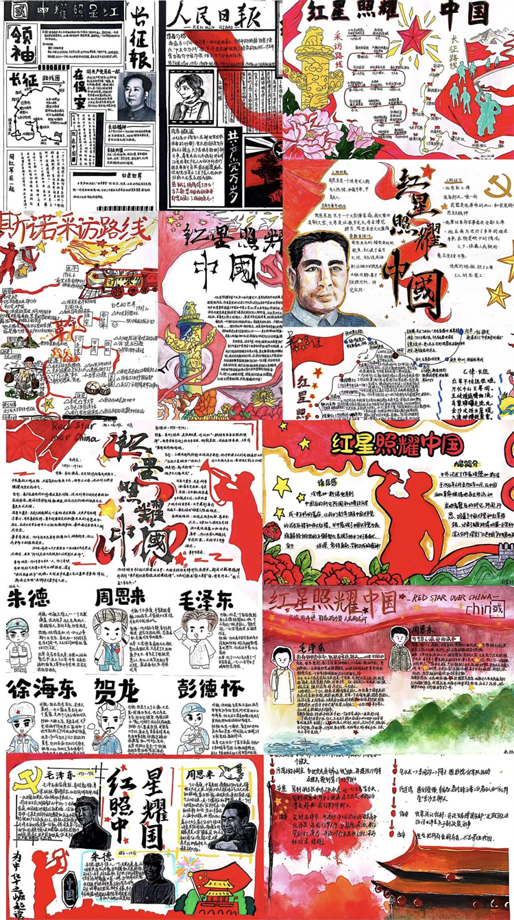 在《紅星照耀中國》專題探究中,同學們也展現出豐富的探究成果。手繪的“斯諾拜訪路線圖”細致還原了1936年斯諾前往陜北的曲折歷程,輔以采訪札記摘抄,生動再現歷史場景;“領袖人物檔案”則以圖文并茂的形式,立體呈現了毛澤東、周恩來、彭德懷等革命領袖的革命經歷與人格魅力。